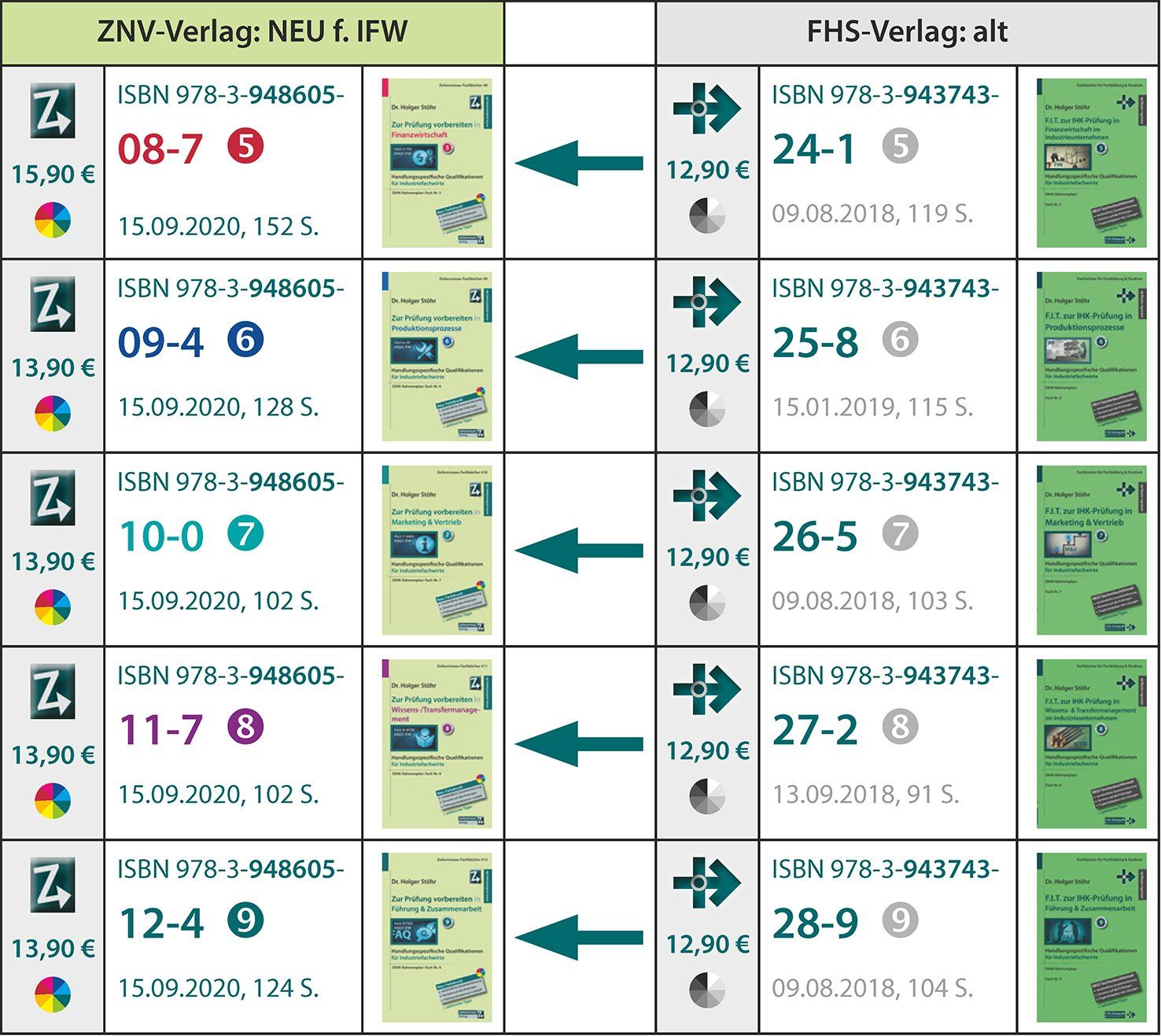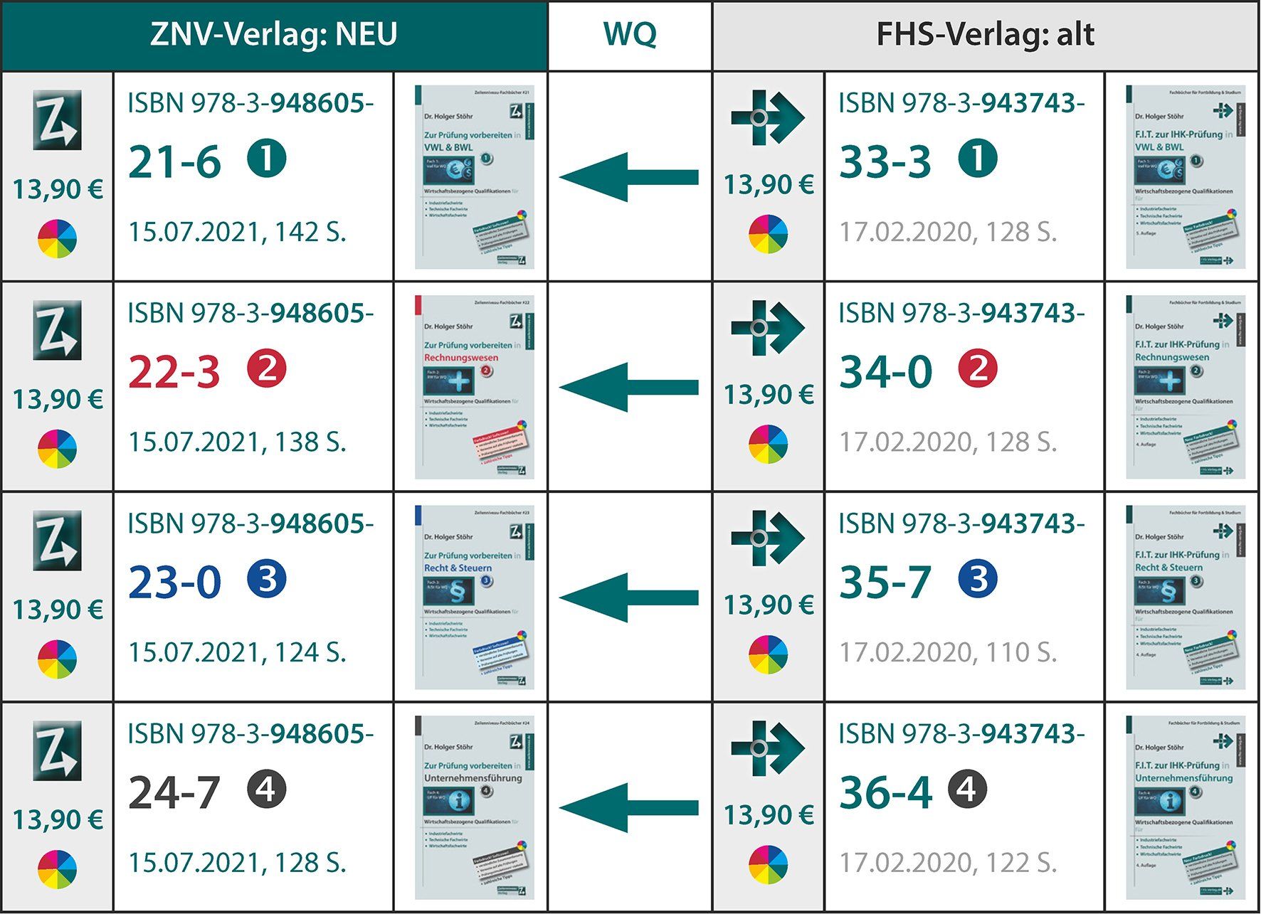 Für die IHK-Prüfung "Wirtschaftsbezogene Qualifikationen" gibt es zu den älteren Auflagen des FHS-Verlags jeweils eine neue Auflage im Zeilenniveau Verlag (ZNV-Verlag). Diese haben einen neuen Namen ("Zur Prüfung vorbereiten in...") anstelle von ("F.I.T. zur IHK-Prüfung in..."), sind alle im 4-Farbdruck, aktueller und daher auch etwas umfangreicher. Aber das bewährte Prinzip wurde beibehalten. In der folgenden Tabelle sehen Sie, welche ältere FHS-Auflage jeweils durch eine neuere ZNV-Auflage ersetzt wird: